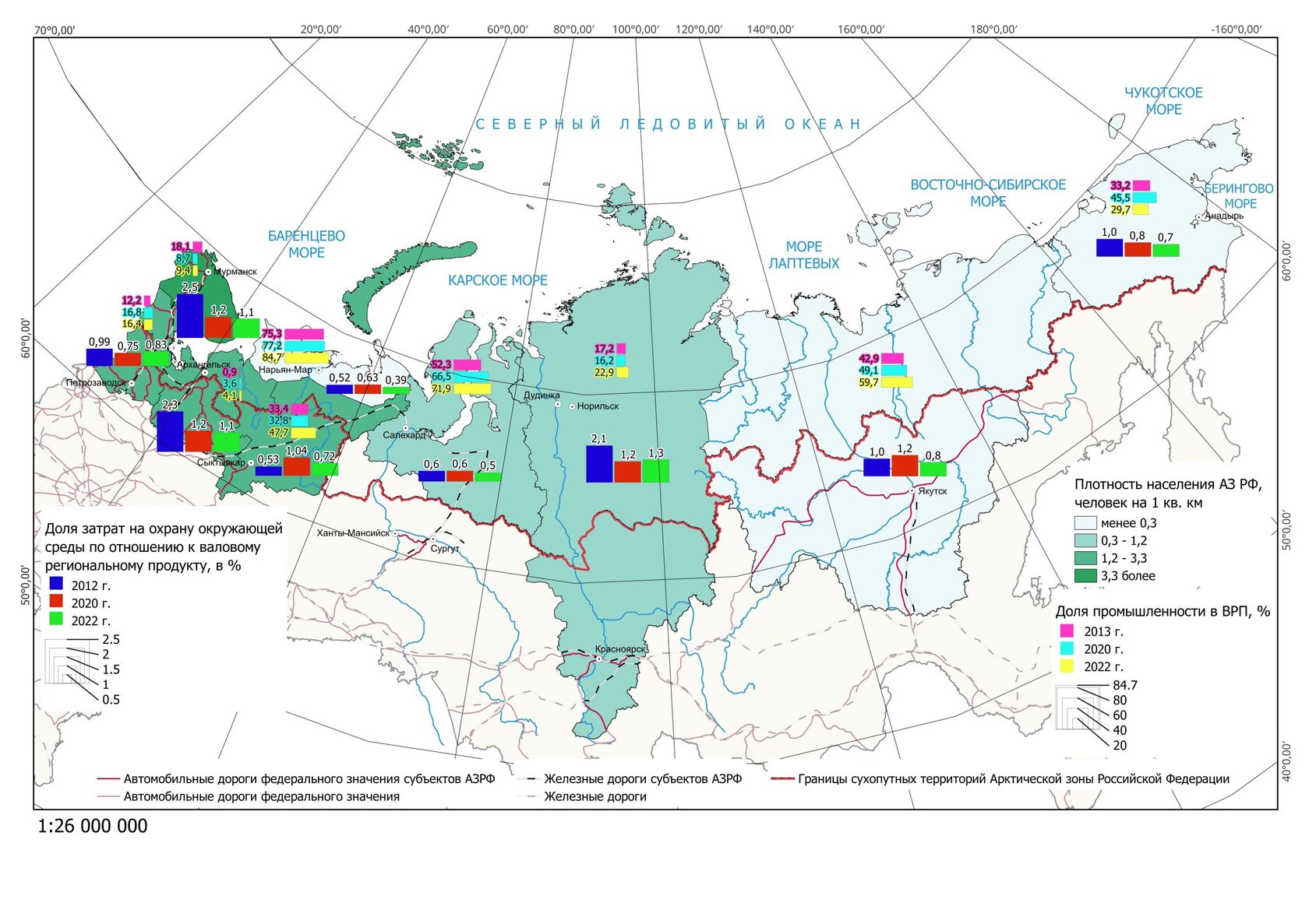 Представляем серию тематические карт, отражающих ключевые экономические и экологические показатели регионов Арктической зоны России за 2013, 2020 и 2022 годы. Тематические карты наглядно демонстрируют взаимосвязь между использованием природных ресурсов, экологическими нагрузками и экономическим развитием регионов.