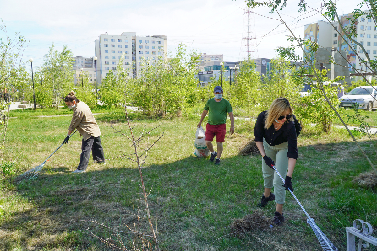 Вооружившись граблями и метлами представители АНИЦ РС (Я) убирали мусор, очищали газоны от засохшей листвы и травы.