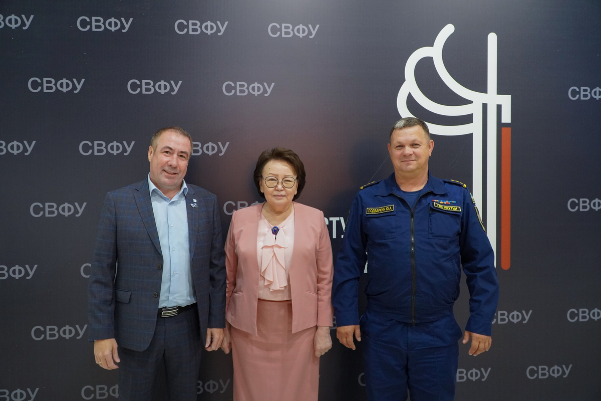 Директор АНИЦ Юрий Шипицын, президент СВФУ Евгения Михайлова и начальник Пожарного отряда Юрий Подваркин.