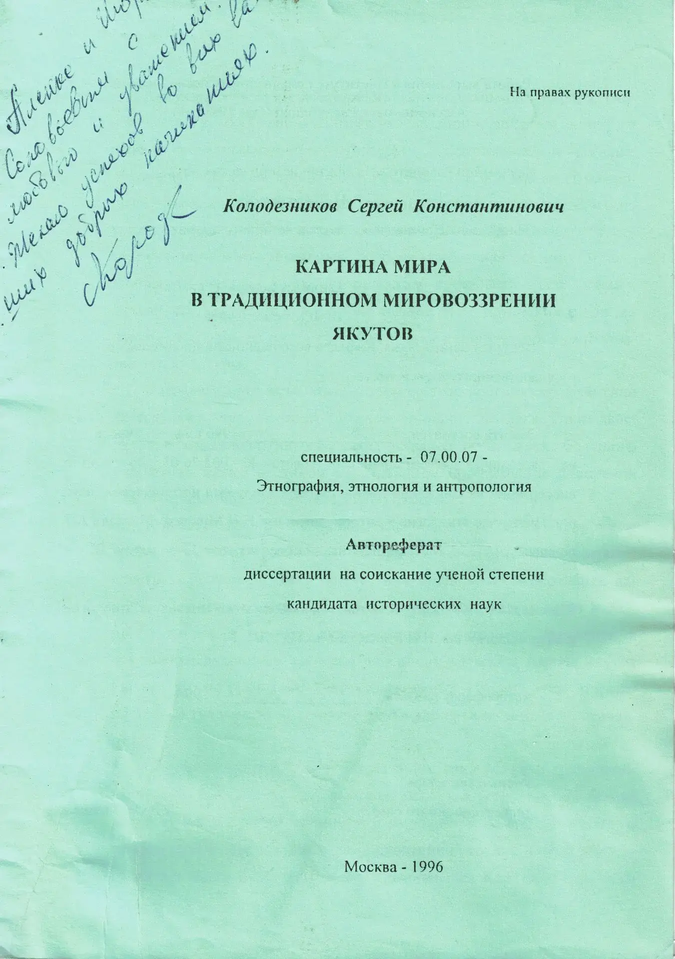 В 1996 году в Москве, в Институте этнологии и антропологии имени Н.Н. Миклухо-Маклая, защитил кандидатскую диссертацию на тему, которая стала главной темой его научной биографии: «Картина мира в традиционном мировоззрении якутов».