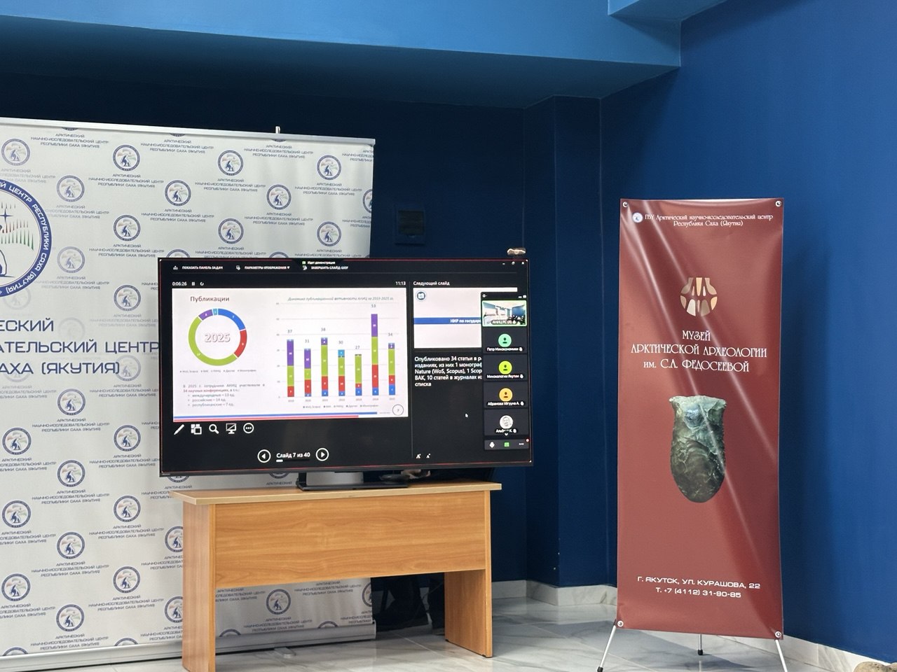 Публичный отчёт прошёл в обновлённом выставочном пространстве Музея арктической археологии АНИЦ, которое в дальнейшем будет использоваться и как лекторий. От имени Минобрнауки Якутии с оценкой положительной динамики работы центра выступили первый заместитель министра Михаил Присяжный, заместитель руководителя профильного департамента Александр Кочмар и главный специалист Надежда Григорьева.