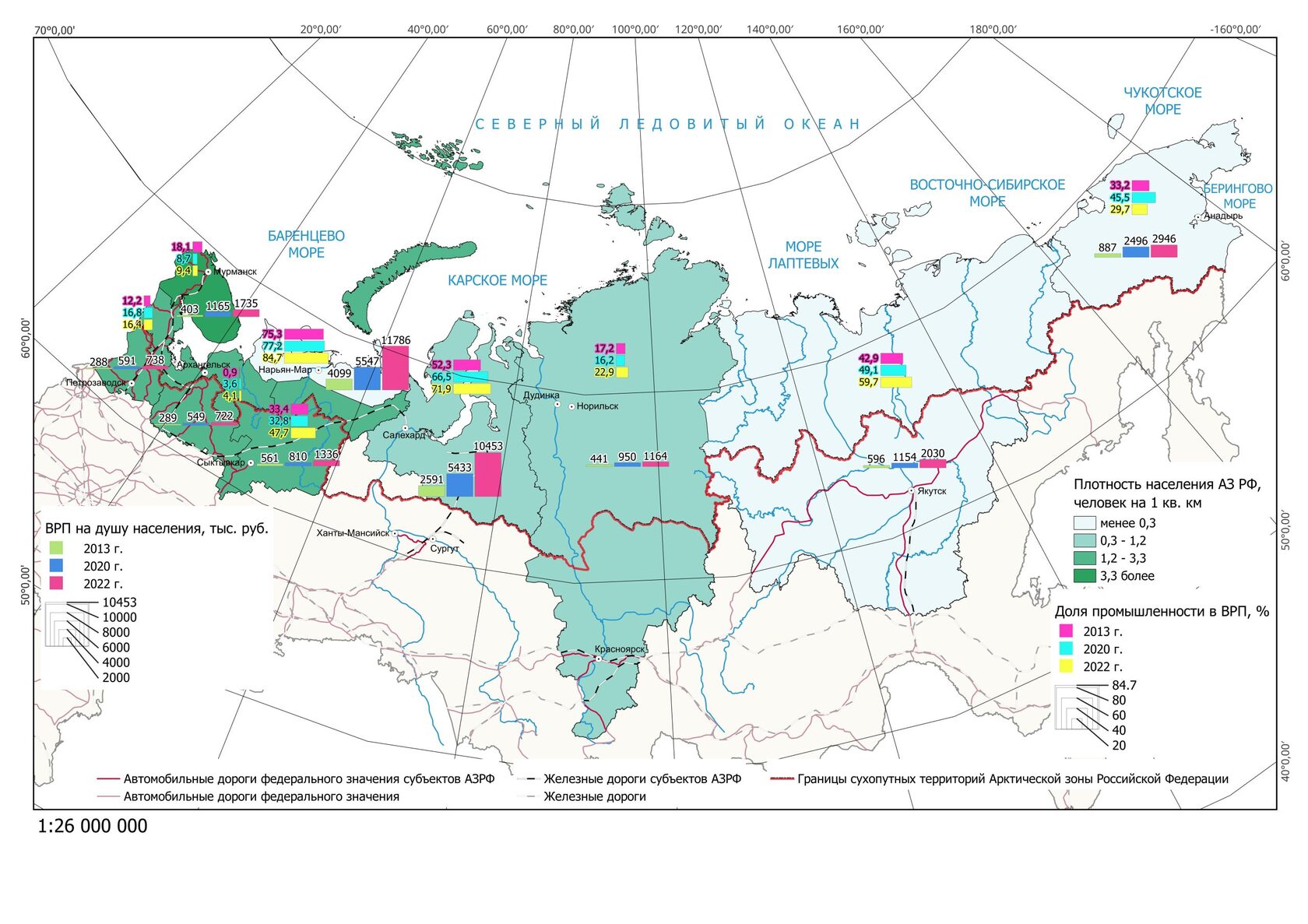 Иллюстрация отражает распределение валового регионального продукта на душу населения (в тыс. руб.) для субъектов Арктической зоны Российской Федерации (АЗРФ) за 2013, 2020 и 2022 годы. Наиболее высокие показатели характерны для регионов с развитой добывающей промышленностью (Ямало-Ненецкий АО, Ненецкий АО). Однако наблюдается значительная дифференциация между регионами.