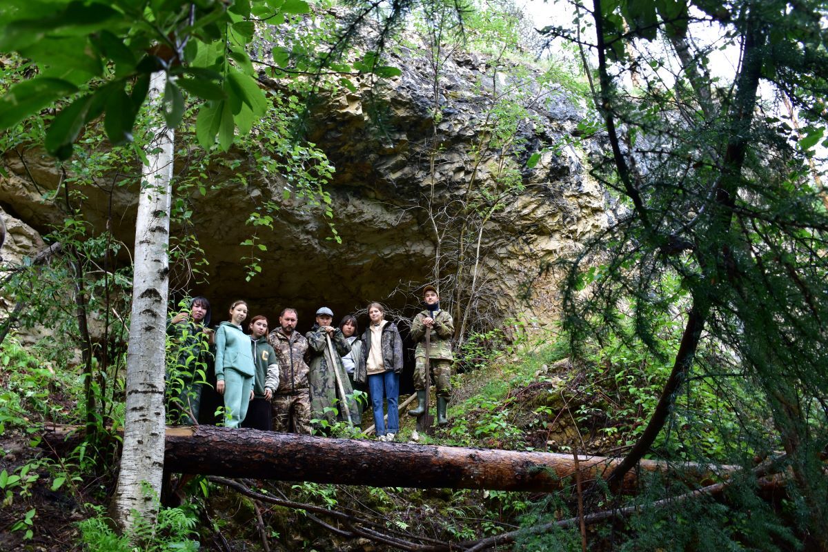 Николай Кирьянов и группа школьников у входа в знаменитую Дюктайскую пещеру.